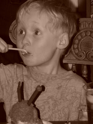 Saturday was his birthday party. It was the first year he asked for friends. Normally, he just wants the grandparents. We had the family first, and then later the kids came. Joel and I embrace the low key. We try to keep things simple. In that vein, the kids that were invited were not allowed to bring presents. Insanity... I know! I also know that some thought we were mean parents. Maybe. I just really feel that, first, he has enough. However, mostly I want him to learn to honor company for company's sake. Their gift to him was them sharing time with him. I want him to learn to ask people to share time with him for the joy in that, not for the crap he can collect from the invitation. So go ahead call me mean... I just hope he won't in therapy one day!